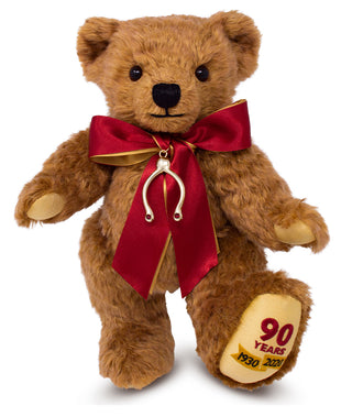 This special limited edition bear combines the ruby (40th) and golden (50th) anniversary year colours throughout its design, and features Merrythought’s 90th anniversary logo embroidered onto its left paw.