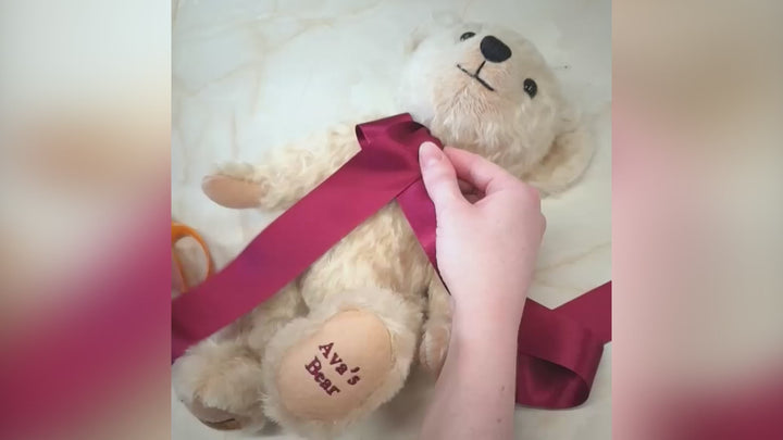 If your companion’s ribbon has come loose while snuggling or you’re simply interested in refreshing its colour, this visual guide will help you re-tie this essential accessory for your bear!