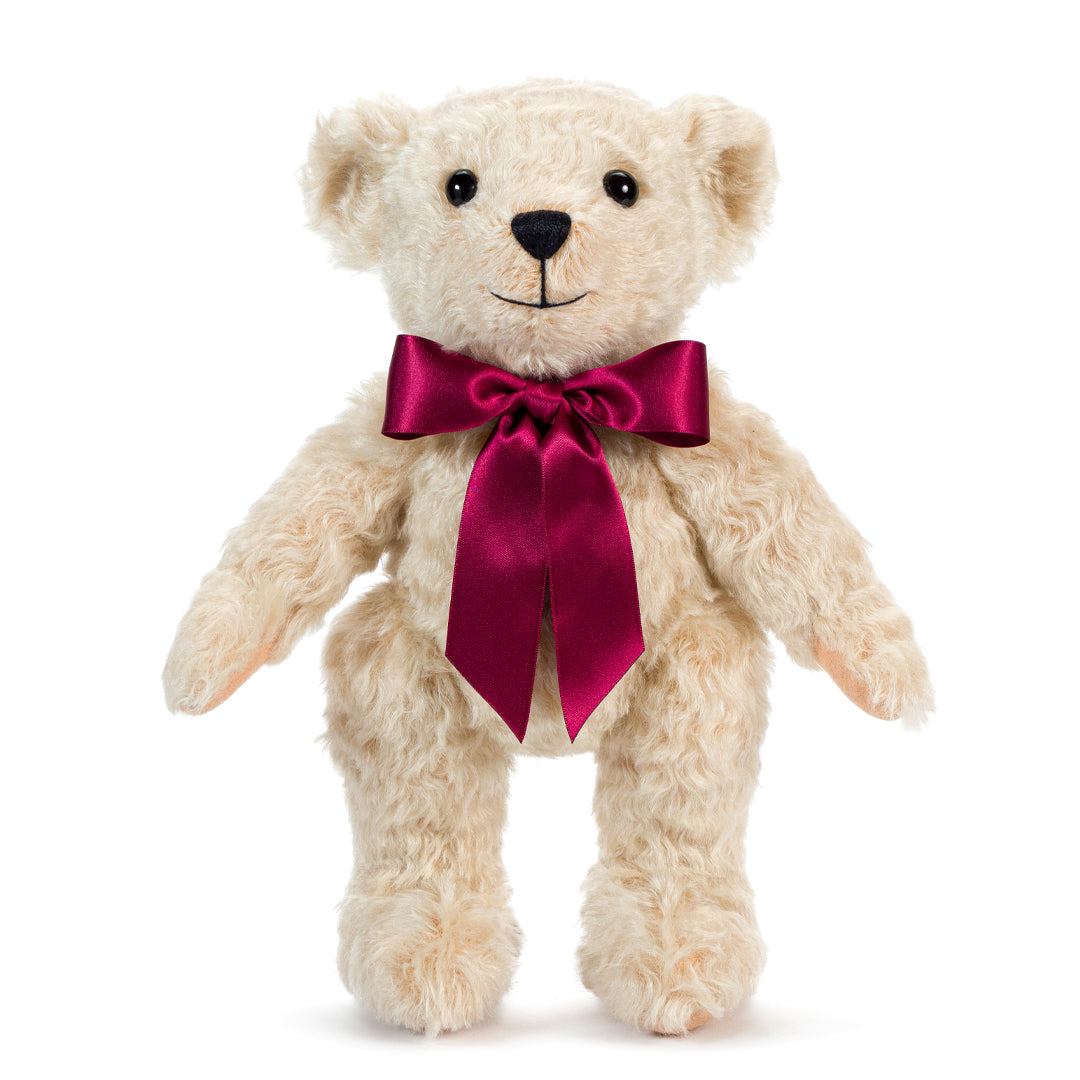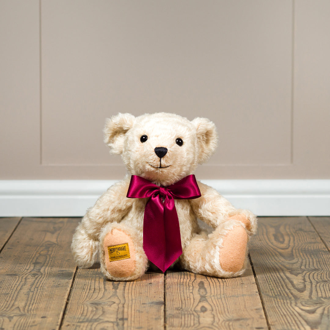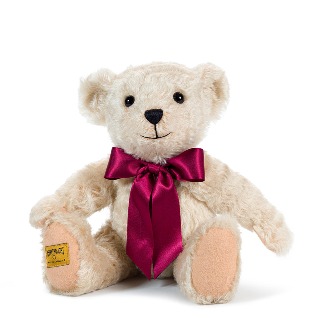 Henley's rich cream mohair plush has been carefully worked with pinky-beige wool felt, both complemented by an opulent burgundy satin bow. A short-trimmed muzzle highlights this friendly bear's beaming smile.