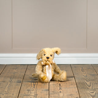 Binky is a trusted companion whose friendly smile will brighten any day. Handmade from dove-grey mohair, he features slender ears that are lined in pure wool felt, along with an adorable fluffy white mohair bobtail that perfectly co-ordinates with his cream satin bow.