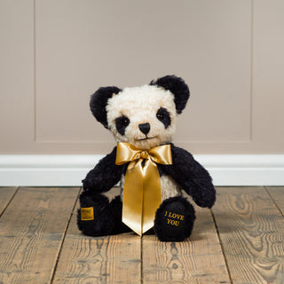 Crafted from rich cream and black mohair plush, this timeless panda has a particularly appealing expression. The bear's distinctive markings, which include black 'eye patches’ and upper body, are subtly complemented by a traditional British racing green satin bow.