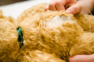 Taking time to fill the soft toy to an optimum weight, it is then ready for the finishing touches; a carefully hand-embroidered nose and smile, a thorough brush and trim, and a neatly tied bow or accessory.