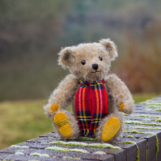 This friendly character has been hand-made from soft, caramel-coloured mohair plush featuring a chocolate-coloured base that beautifully complements his pure wool felt paws. He wears a traditional, satin-lined waistcoat made from the finest British tweed and secured with brass studs. Waistcoat is fully removable.