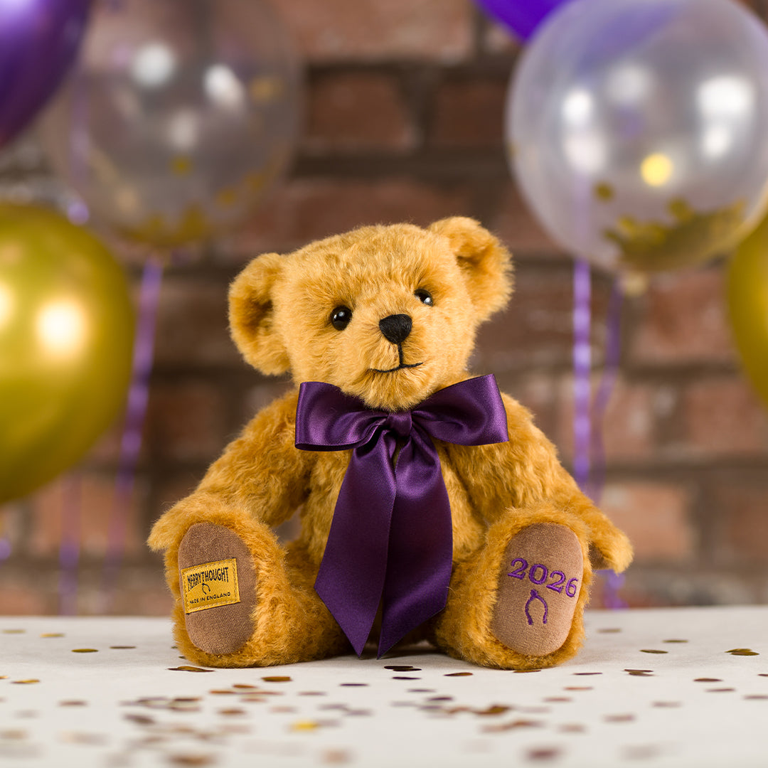 Handmade from the finest deep-gold wavy mohair plush, each limited edition bear features pure cotton velvet paws, one of which is neatly embroidered with the iconic Merrythought wishbone and the year ‘2026’.